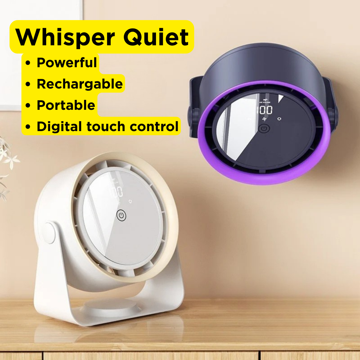 Experience powerful airflow in total silence with the WhisperFlow Rechargeable Fan. Designed for home, office, or on-the-go use, this ultra-quiet fan delivers high-performance cooling in a sleek, compact form. Its advanced 7-feather blade turbine system ensures whisper-quiet operation while pushing air up to 15 meters, making it ideal for focused work, restful sleep, or personal comfort anywhere.
